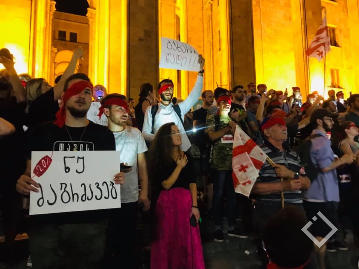 აქციის მონაწილეებმა ცალი თვალი წითელი ლენტით დამალეს. თვალახვეულმა დემონსტრანტებმა საქართველოს ჰიმნი იმღერეს. ''გახარია წადი'', ''ნუ მაბრმავებ'' - 20% ოკუპირებულია - რუსთაველის გამზირზე,...