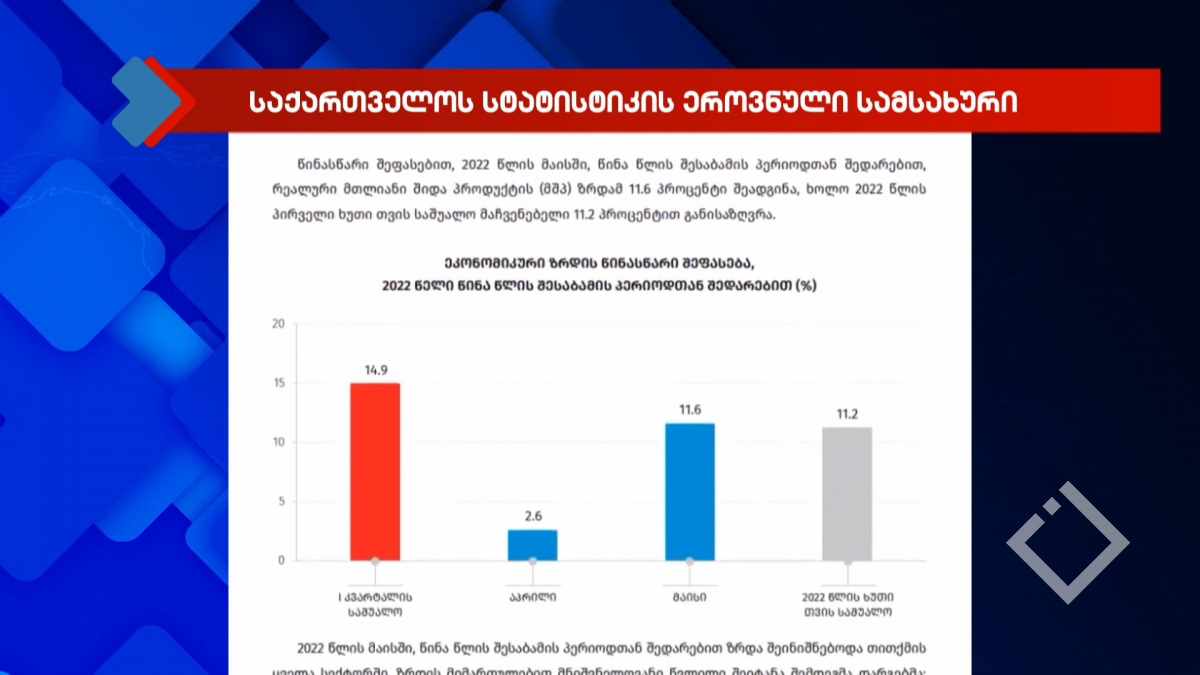 მაისში, წინა წლის შესაბამის პერიოდთან შედარებით მთლიანი შიდა პროდუქტი 11,6 %-ით არის გაზრდილი. 2022 წლის იანვარ-მაისში კი რეალური ზრდის საშუალო...