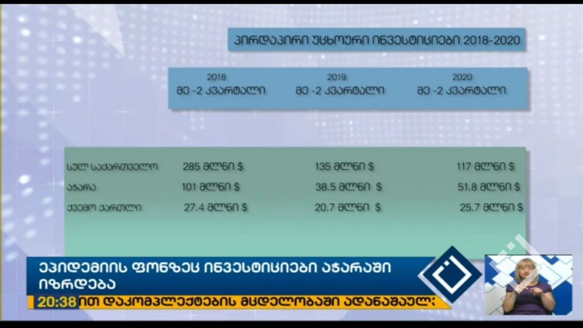 რამდენი უცხოური ინვესტიცია შემოვიდა საქართველოში 2018-2020 წლებში, მეორე კვარტლის, ანუ 6 თვის მონაცემებით. 2 წლის წინ ქვეყანაში შემოსული ინვესტიციების თითქმის...