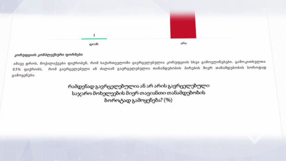 ის, რომ საქართველოში კორუფცია და ნეპოტიზმია - სახელმწიფო მმართველობის ხარვეზს უწოდებენ - მმართველ გუნდში. ქვეყანაში იშვიათია წვრილმანი კორუფცია, თუმცა გამოწვევად...