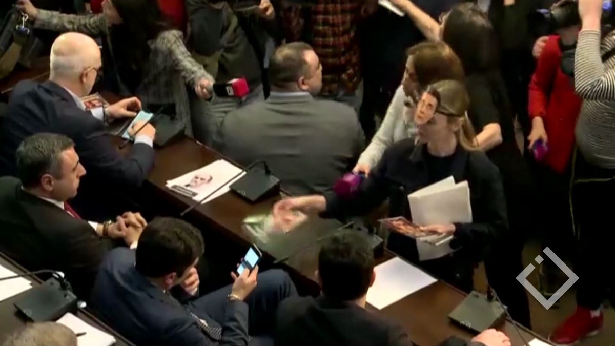 პარლამენტთან და სხდომათა დარბაზში ხმაურია დილიდან. იურიდული კომიტეტის სხდომაზე ელენე ხოშტარია და თინა ბოკუჩავა ბიძინა ივანიშვილის ნიღბებით და მათი შეფასებით...