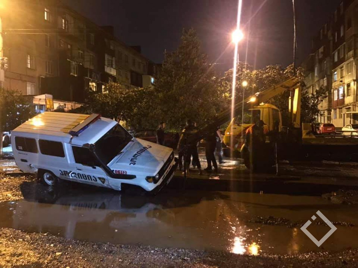 ბათუმში, ჯავახიშვილის ქუჩაზე, პოლიციის მანქანა ორმოში ჩავარდა. ავტომანქანა ამწეს დახმარებით ამოიყვანეს.