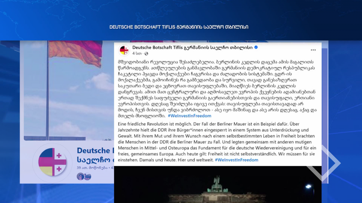 მშვიდობიანი რევოლუცია შესაძლებელია. ბერლინის კედლის დაცემა ამის მაგალითს წარმოადგენს, – ამის შესახებ საქართველოში გერმანიის საელჩოს ფეისბუქგვერდზე, ბერლინის კედლის დანგრევის 35...
