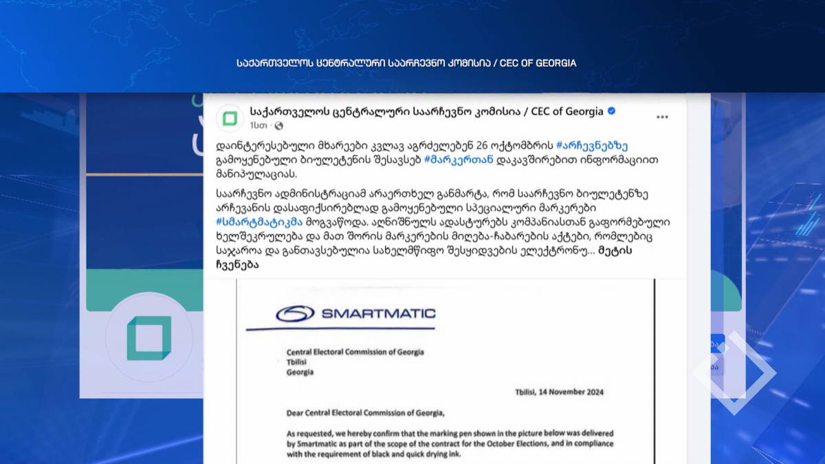 საქართველოს ცენტრალური საარჩევნო კომისია განცხადებას ავრცელებს, სადაც წერია, რომ "პოლიტიკოსები საზოგადოებას კვლავ არწმუნებენ, რომ ცესკომ მარკერები შეცვალა, რაც არის სრული...