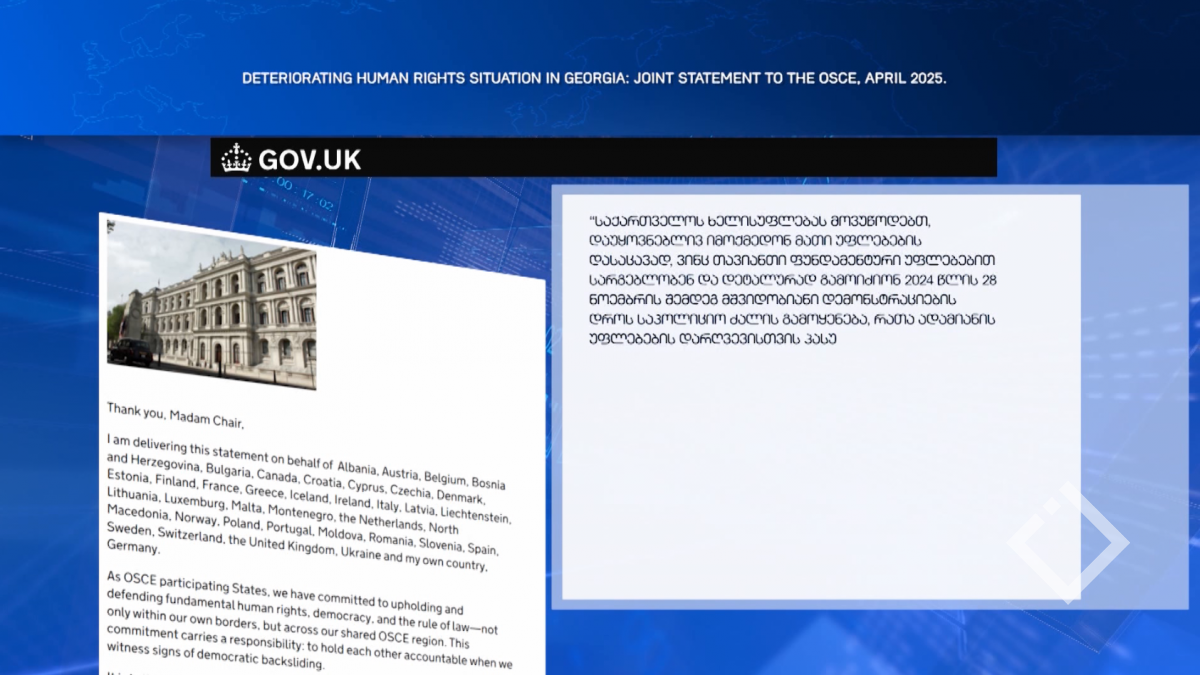 37 ქვეყანა ეუთოს მიმართავს საქართველოში არსებულ პოლიტიკაზე გავლენის მოხდენის მიზნით ისინი ხელისუფლებისგან ითხოვენ ბოლო რამდენიმე თვეში აქციაზე დაკავებული ჟურნალისტების გათავისუფლებას,...