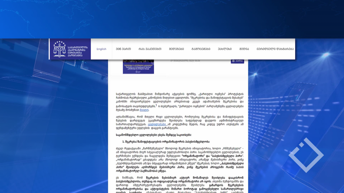 ,,საქართველოს მასშტაბით მიმდინარე აქციების ფონზე, „ქართული ოცნება“ პროტესტის ჩახშობას რეპრესიული კანონების მიღებით ცდილობს, - ასე აფასებენ საქართველოს ახალგაზრდა იურისტთა ასოციაციაში “შეკრებისა...