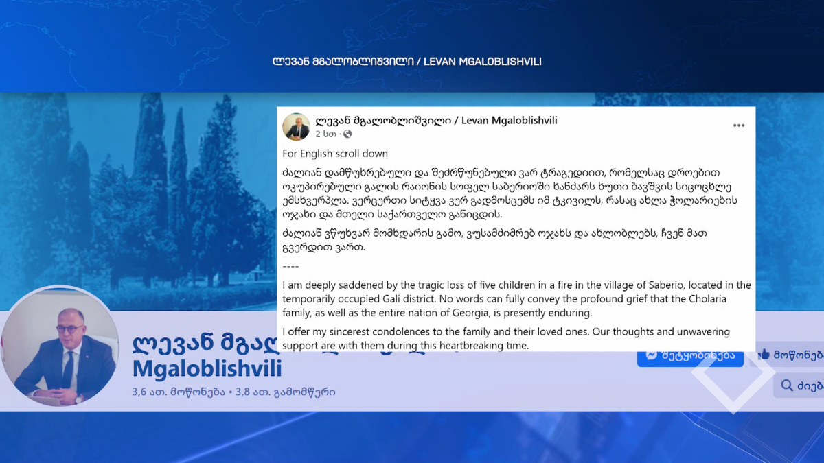 ოკუპირებული აფხაზეთის ტერიტორიაზე, გალის რაიონის სოფელ საბერიოში ხანძრის შედეგად დაღუპულთა ხსოვნის პატივსაცემად დღეს საქართველოში გლოვის დღეა. გლოვის დღესთან დაკავშირებით დროშები...
