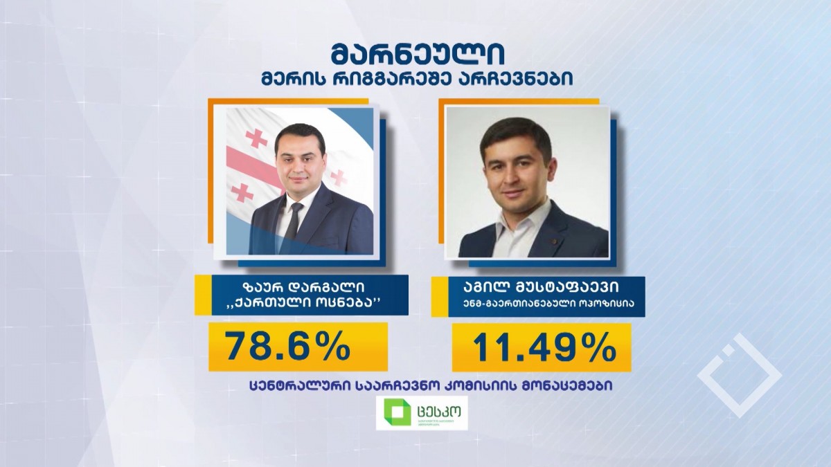 მარნეულის მერის რიგგარეშე არჩევნებში ქართული ოცნების კანდიდატმა ზაურ დარგალმა გაიმარჯვა. მან ხმათა 78.6% მიიღო. ცესკოს მიერ წინასწარი მონაცემების გამოქვეყნებამდე უბნის...