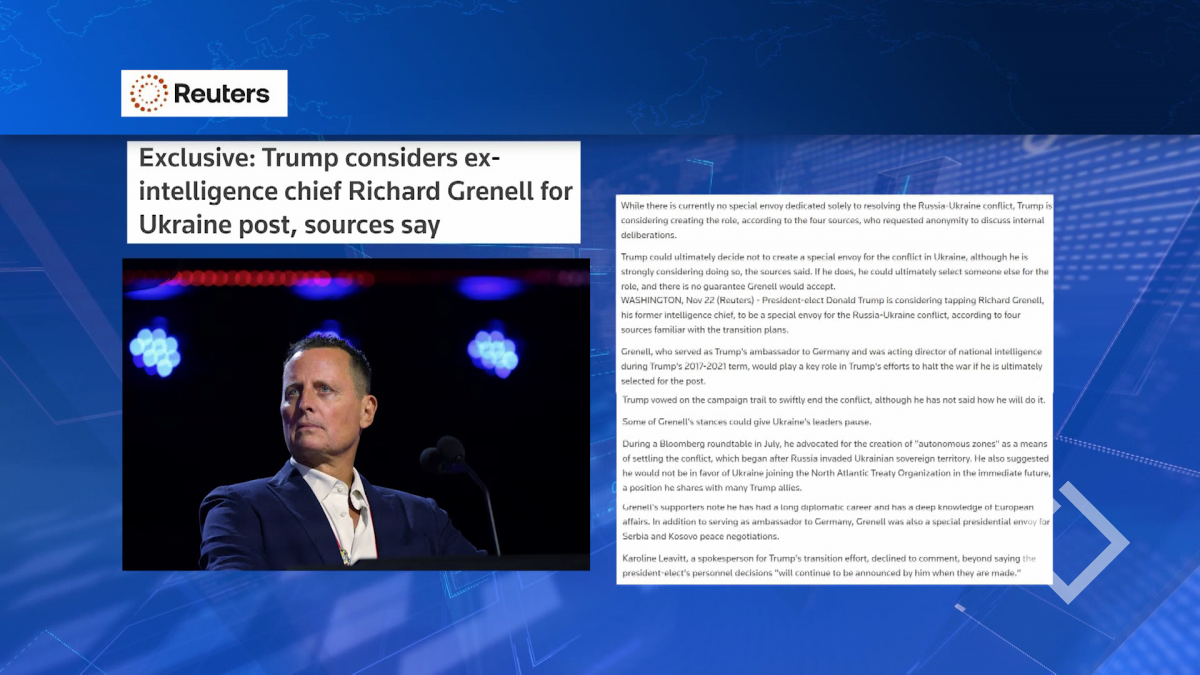 აშშ-ის არჩეული პრეზიდენტი რუსეთ-უკრაინის კონფლიქტზე სპეციალური წარმომადგენლის დანიშვნას განიხილავს. გამოცემა „როიტერი“ ანონიმურ წყაროზე დაყრდნობით წერს, რომ თანამდებობაზე რიჩარდ გრენელი განიხილება,...