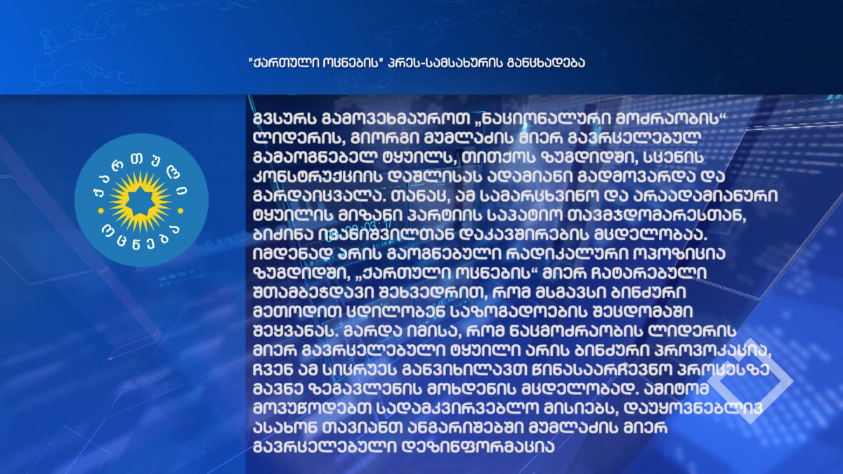 პარტია „ქართული ოცნება“ „გამაოგნებელ ტყუილს“ უწოდებს „ნაციონალური მოძრაობის“ მიერ გავრცელებულ ინფორმაციას, რომ ზუგდიდში, მმართველი პარტიის საარჩევნო ღონისძიებისთვის დამონტაჟებული სცენის კონსტრუქციის...