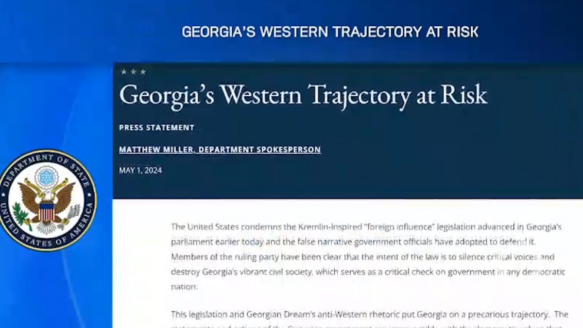 საქართველოს დასავლური ტრაექტორია რისკის ქვეშაა - ამის შესახებ ნათქვამია ამერიკის შეერთებული შტატების სახელმწიფო დეპარტამენტის პრესსპიკერის განცხადებაში, რომელიც სახელმწიფო დეპარტამენტის ვებ-გვერდზე...