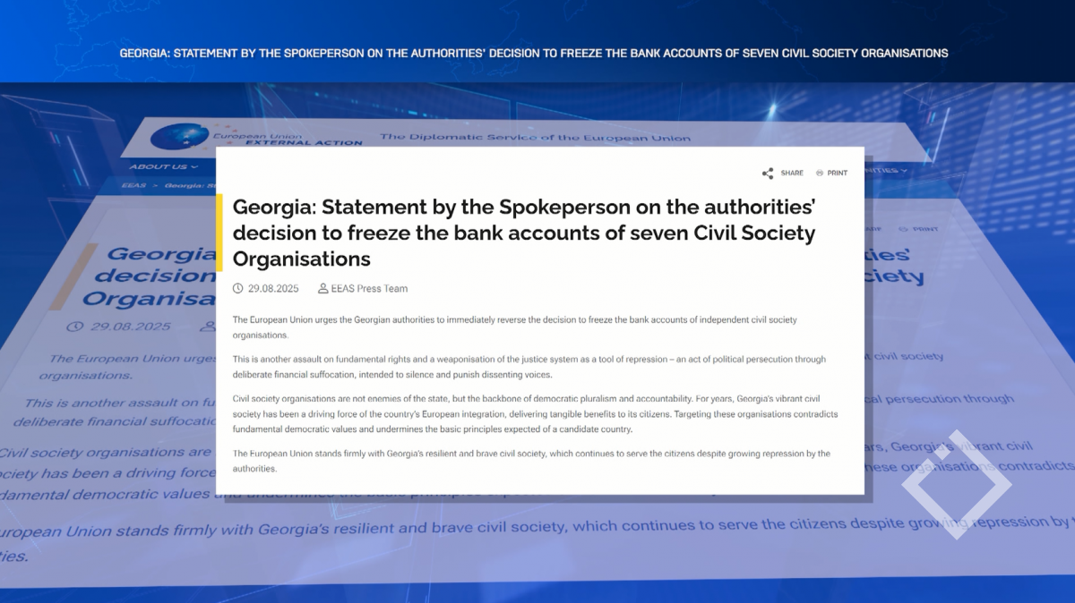 ევროკავშირი საქართველოს ხელისუფლებას მოუწოდებს, დაუყოვნებლივ შეცვალოს გადაწყვეტილება დამოუკიდებელი სამოქალაქო ორგანიზაციების საბანკო ანგარიშების გაყინვის შესახებ, – ამის შესახებ ნათქვამია საგარეო და...