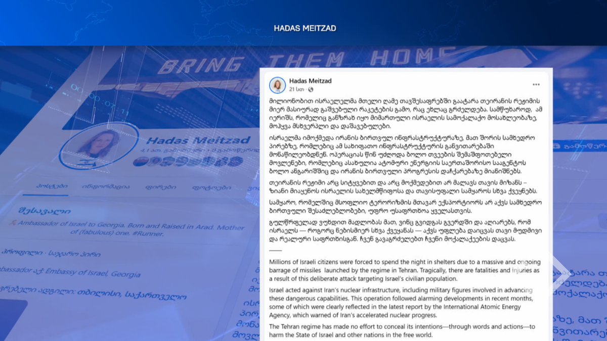 ,,ისრაელი გააგრძელებს საკუთარი მოქალაქეების დაცვას“- ამის შესახებ საქართველოში ისრაელის ელჩი, ჰადას მეიცადი სოციალურ ქსელში წერს. დიპლომატის ტქმით, ისრაელმა იმოქმედა ირანის...