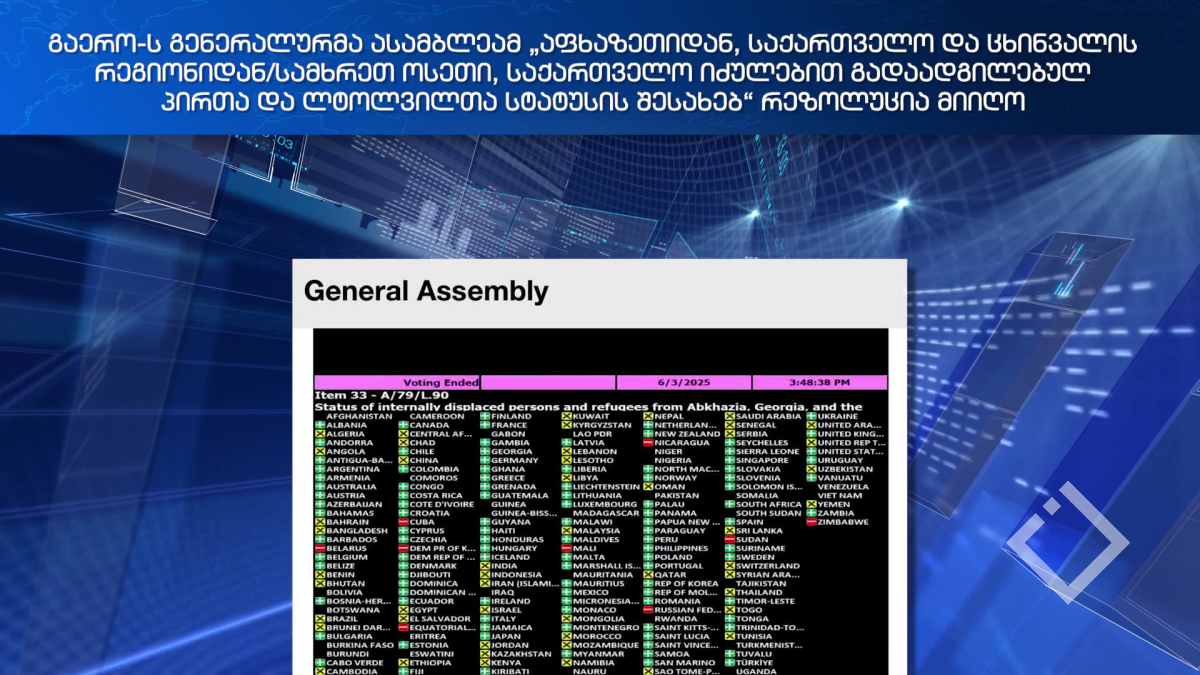 გაერო-ს გენერალურმა ასამბლეამ რეზოლუცია მიიღო - „აფხაზეთიდან, საქართველო და ცხინვალის რეგიონიდან/სამხრეთ ოსეთი, საქართველო იძულებით გადაადგილებულ პირთა და ლტოლვილთა სტატუსის შესახებ“....