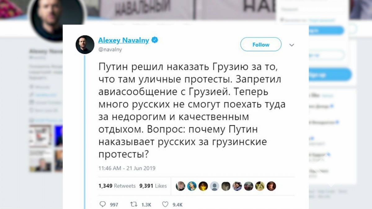რუსეთის ხელისუფლების ოპოზიციის ლიდერი ალექსეი ნავალნი ვლადიმერ პუტინს აკრიტიკებს, 8 ივლისიდან საქართველოს მიმართულებით ავიამიმოსვლის აკრძალვის გამო. რუსი ოპოზიციონერი აცხადებს, რომ...
