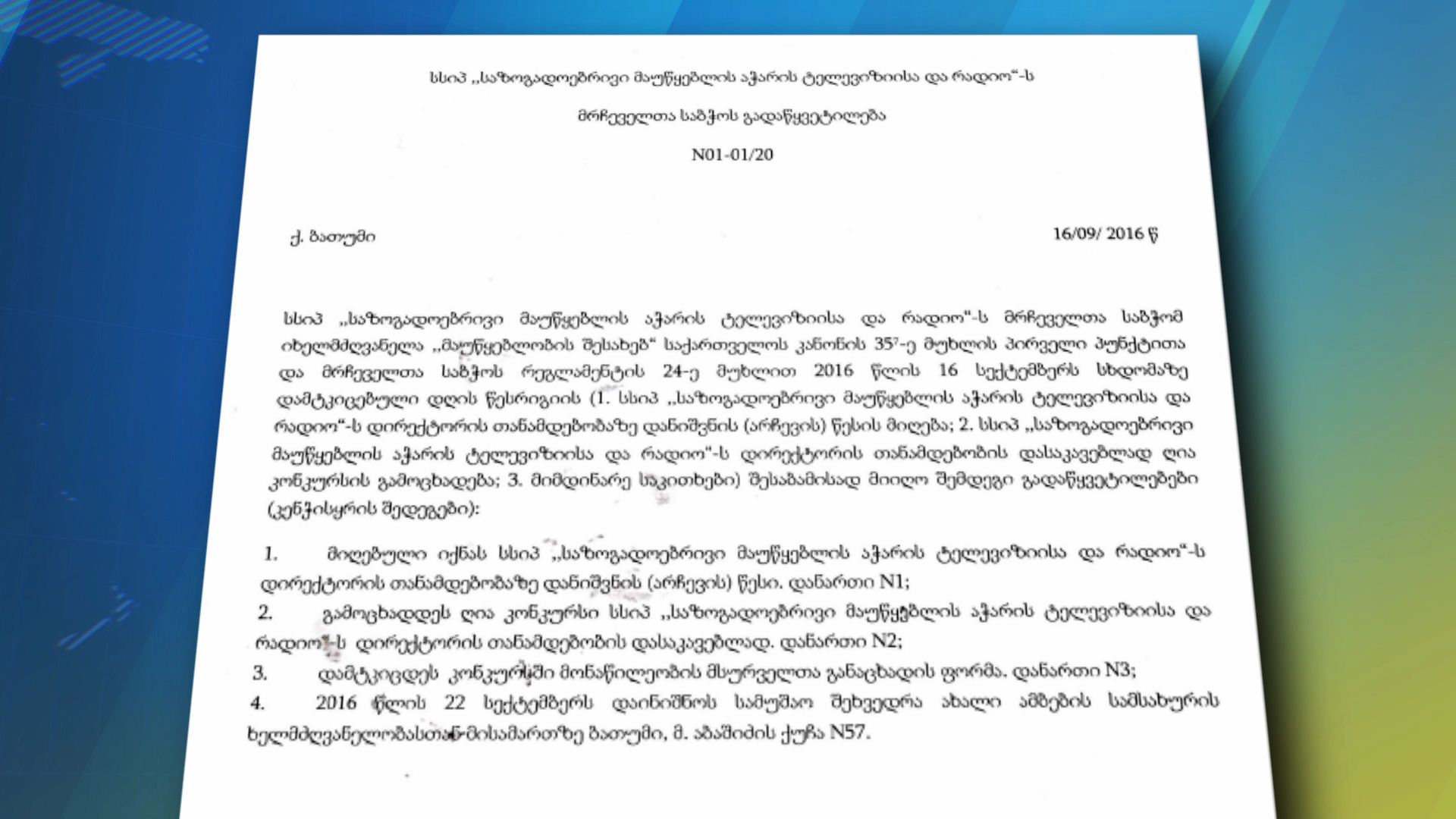 დღეიდან საზოგადოებრივი მაუწყებლის აჭარის ტელევიზიისა და რადიოს დირექტორის პოზიციაზე კონკურსში, მონაწილეთა განცხადებების მიღება დაიწყო. დირექტორის თანამდებობაზე დანიშვნის წესი მაუწყებლის მრჩეველთა...