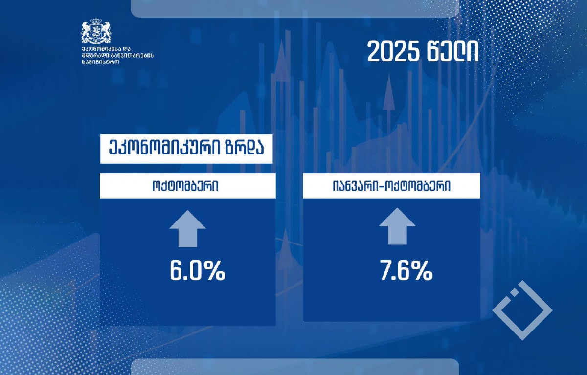საქართველოს ეკონომიკის სამინისტროს ინფორმაციით, 2025 წლის ოქტომბერში საქართველოს ეკონომიკა 6.0%-ით გაიზარდა, ხოლო 2025 წლის იანვარი-ოქტომბრის საშუალო ეკონომიკური ზრდა 7.6%-ით განისაზღვრა. უწყების...