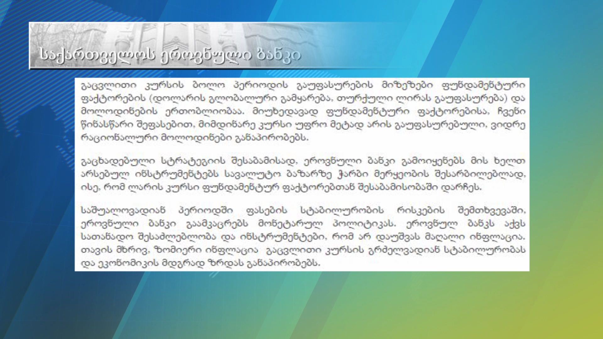 ''ეროვნული ბანკი გამოიყენებს მის ხელთ არსებულ ინსტრუმენტებს სავალუტო ბაზარზე ჭარბი მერყეობის შესარბილებლად'' ამ შინაარსის განცხადებით უწყება გაცვლითი კურსის ბოლო პერიოდის გაუფასურებას...