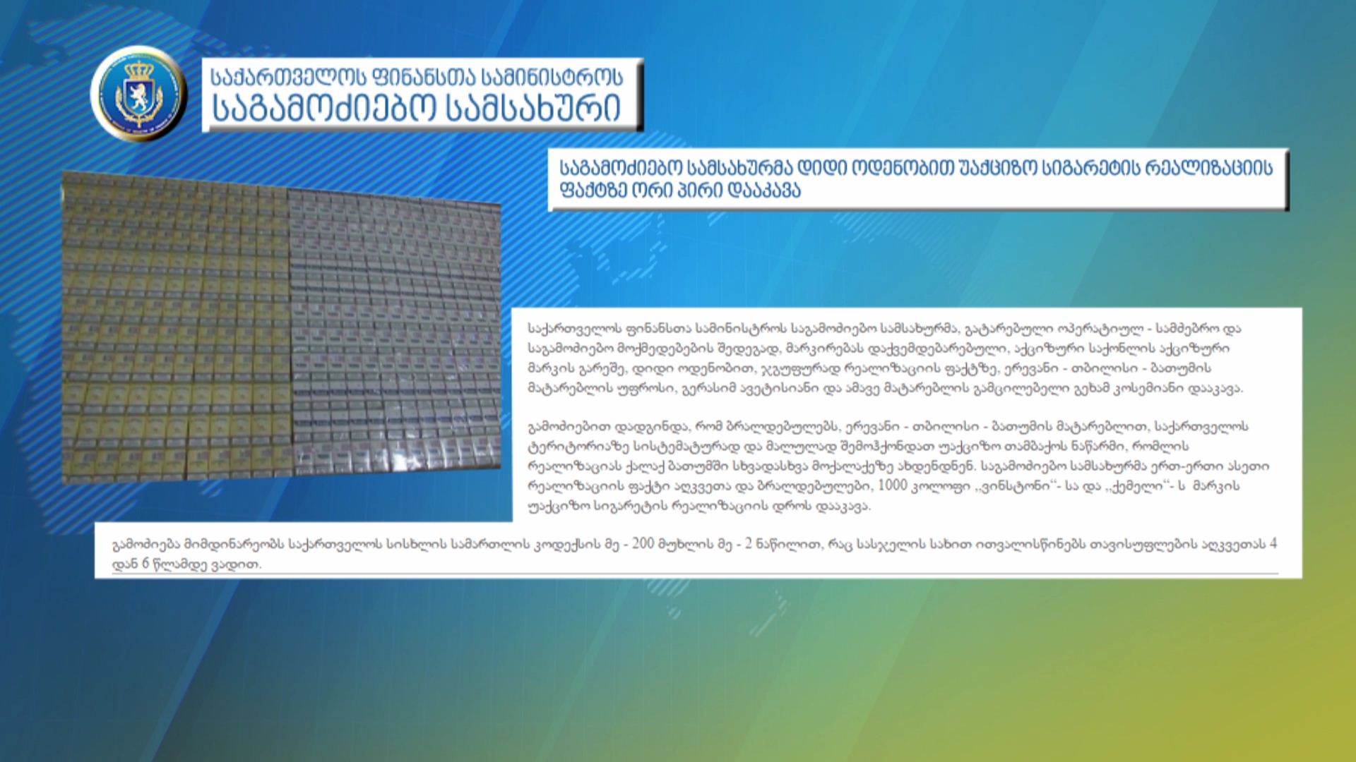 დიდი ოდენობით უაქციზო სიგარეტის რეალიზაციის ფაქტზე ორი პირია დაკავებული: ერევანი - თბილისი - ბათუმის მატარებლის უფროსი და ამავე მატარებლის გამცილებელი....