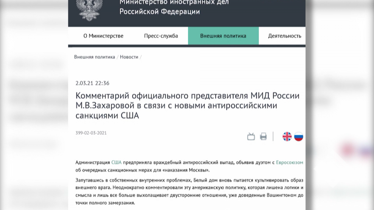 რუსეთის საგარეო საქმეთა სამინისტრო აშშ-ის მიერ სანქციების დაწესებას მტრულ ქმედებად აფასებს და ვაშინგტონს მოუწოდებს, ცეცხლს ნუ ეთამაშება. „აშშ-ის ადმინისტრაციამ მტრული,...
