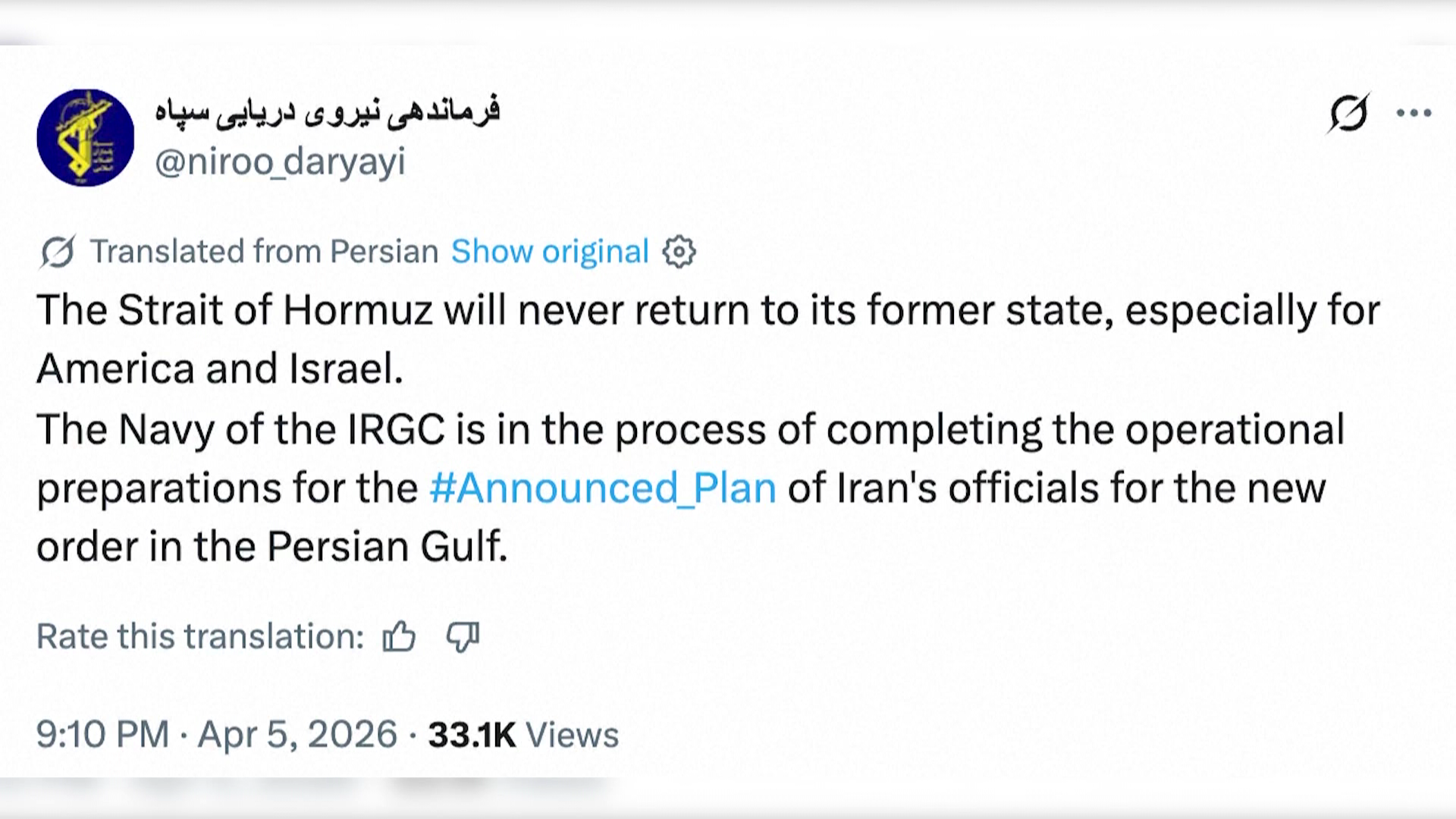 ირანის რევოლუციური გვარდიის კორპუსი აცხადებს, რომ ჰორმუზის სრუტე „არასდროს დაუბრუნდება თავის პირვანდელ მდგომარეობას“ და აფრთხილებს შეერთებულ შტატებსა და ისრაელს სპარსეთის ყურეში...