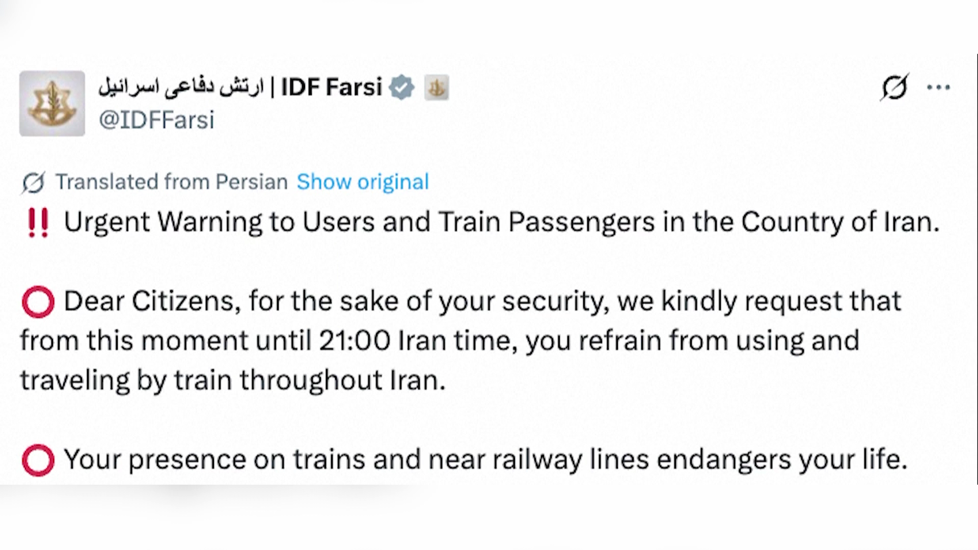 ისრაელმა ირანის მოსახლეობას მოუწოდა თავი შეიკავოს მატარებლით მგზავრობისა და რკინიგზის ხაზებთან მიახლოებისგან, რადგან ეს მათ სიცოცხლეს „საფრთხის ქვეშ დააყენებს“. 28...