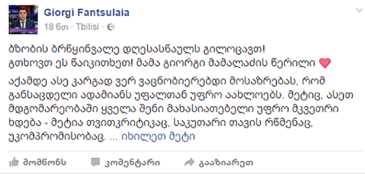 დეკანოზი მამა გიორგი მამალაძე, რომელიც უკვე მეოთხე დღეა შიმშილობს ციხიდან წერილს ავრცელებს. დეკანოზის მიმართვას სოციალურ ქსელში, ადვოკატ, გიორგი ფანცულაია აქვეყნებს....