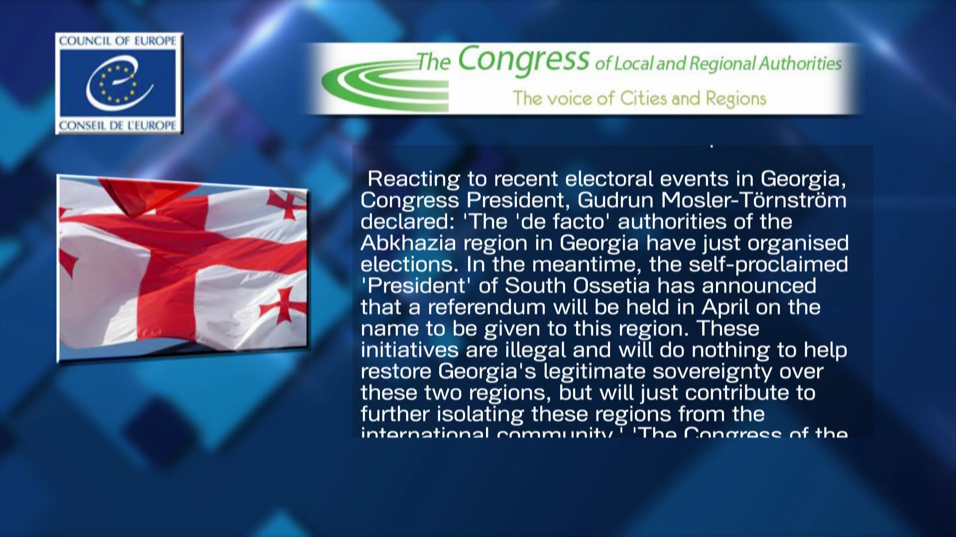 ''სახელმწიფოს ტერიტორიული მთლიანობა რეგიონული განზომილების განვითარების გარანტიაა'' - ევროპის საბჭოს კონგრესის პრეზიდენტმა დაგმო ე.წ. საპარლამენტო არჩევნები აფხაზეთის რეგიონში და ე.წ. რეფერენდუმი...