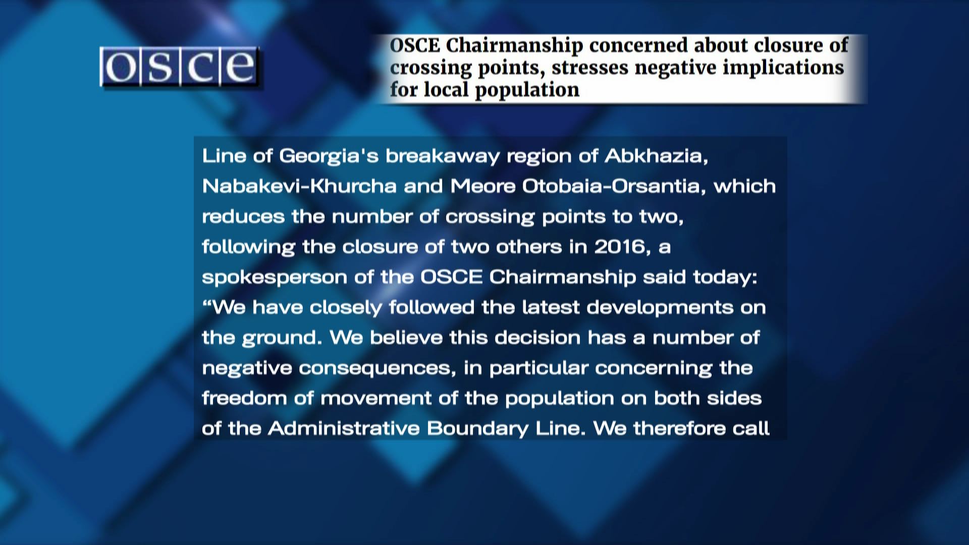 ეუთოს თავმჯდომარეობამ შეშფოთება გამოხატა საქართველოს აფხაზეთის რეგიონში ე.წ. გადასასვლელი პუნქტების დახურვასთან დაკავშირებით და ხაზი გაუსვა მის ნეგატიურ შედეგებს ადგილობრივი მოსახლეობისთვის,...