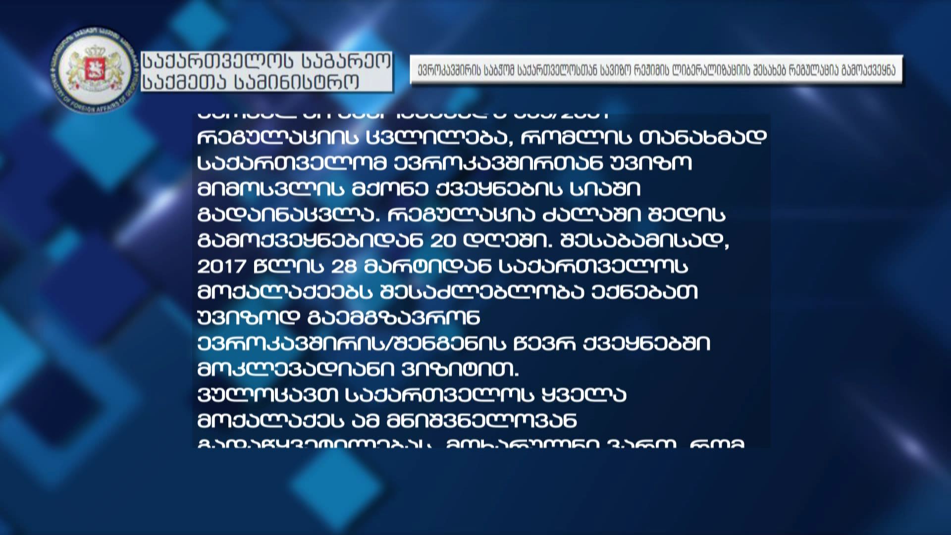 საქართველოს მოქალაქეებისთვის უვიზო რეჟიმთან დაკავშირებით მიღებული გადაწყვეტილება ევროკავშირის ოფიციალურ ჟურნალში უკვე გამოქვეყნდა. საქართველოს მოქალაქეებისთვის უვიზო მიმოსვლის შემოღებასთან დაკავშირებული რეგულაცია, რომელსაც...