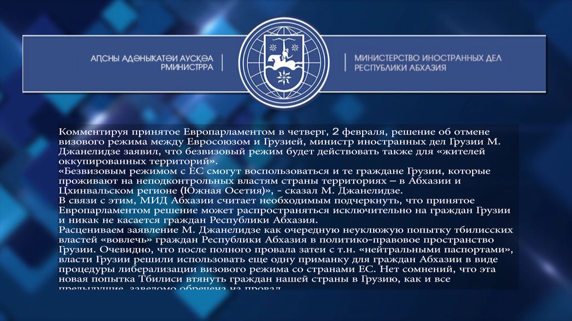 თვითაღიარებული აფხაზეთის რესპუბლიკის საგარეო საქმეთა სამინისტრო მიხეილ ჯანელიძის განცხადებას გამოეხმაურა, რომლის თანახმად ვიზალიბერალიზაციით სარგებლობა ოკუპირებულ ტერიტორიაზე მცხოვრებ მოსახლეობასაც შეეძლება. დე-ფაქტო...