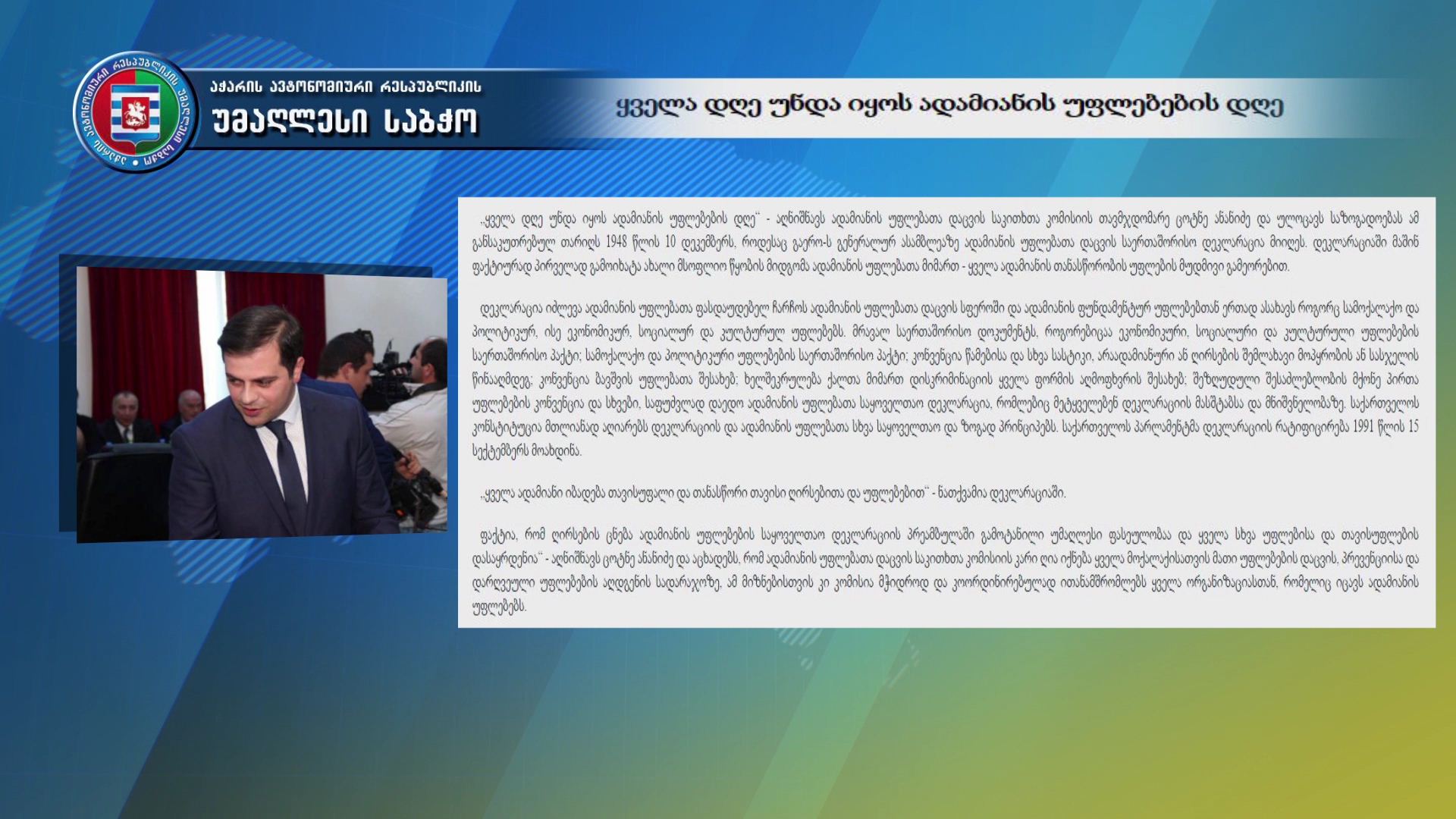 „ყველა დღე უნდა იყოს ადამიანის უფლებების დღე“ -ასე ეხმაურება თარიღს უმაღლესი საბჭოს ადამიანის უფლებათა დაცვის საკითხთა კომისიის თავმჯდომარე. განცხადებაში, რომელიც ...