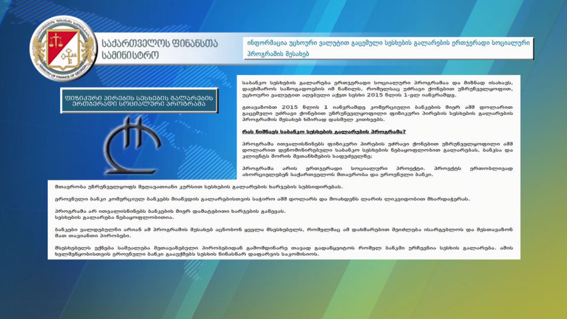 საქართველოს ფინანსთა სამინისტრო 2015 წლის 1 იანვრამდე უცხოური ვალუტით გაცემული იპოთეკური სესხების გალარების ერთჯერადი სოციალური პროგრამის შესახებ ინფორმაციას ავრცელებს. მასში...