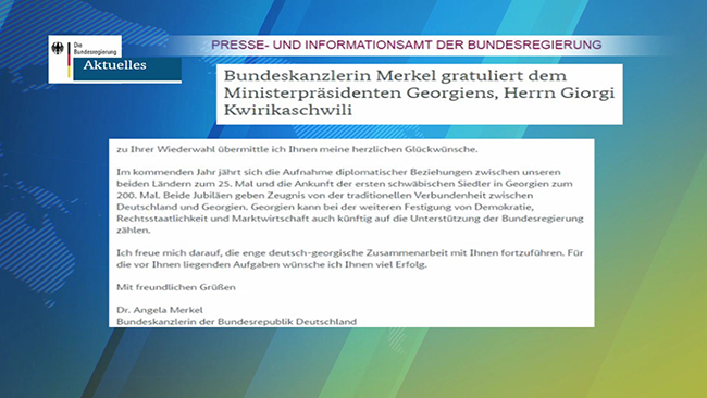 გერმანიის ფედერალური კანცლერი ანგელა მერკელი გიორგი კვირიკაშვილს საქართველოს პრემიერ-მინისტრად ხელახლა არჩევას ულოცავს. მერკელი საქართველოს მთავრობის მეთაურს დასახული მიზნების განხორციელებაში წარმატებებს...