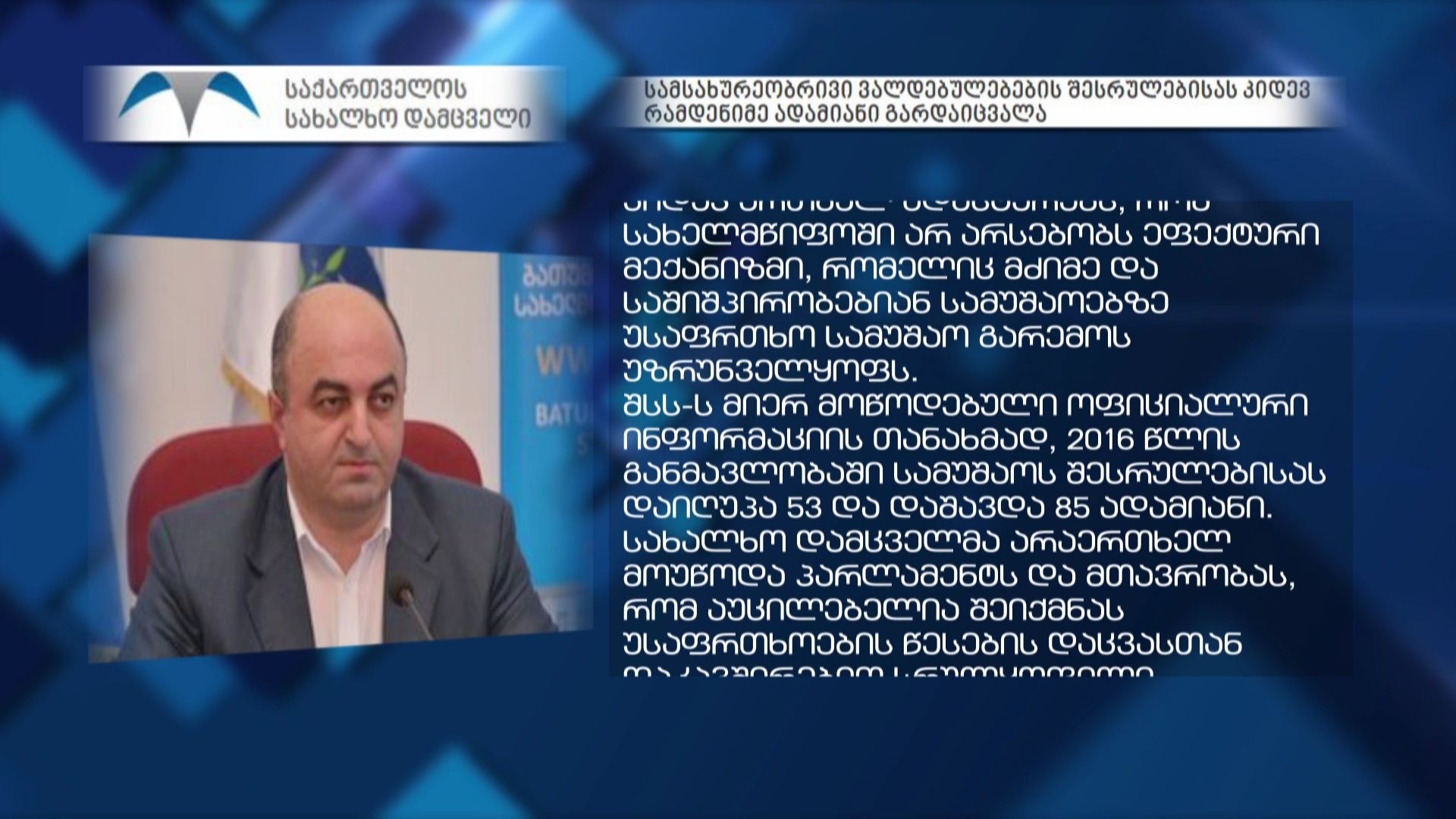 2016 წლის განმავლობაში სამუშაოს შესრულებისას დაიღუპა 53 და დაშავდა 85 ადამიანი. აღნიშნულ ინფორმაციას სახალხო დამცველის აპარატი, შსს-ს მიერ მიწოდებული ოფიციალური...