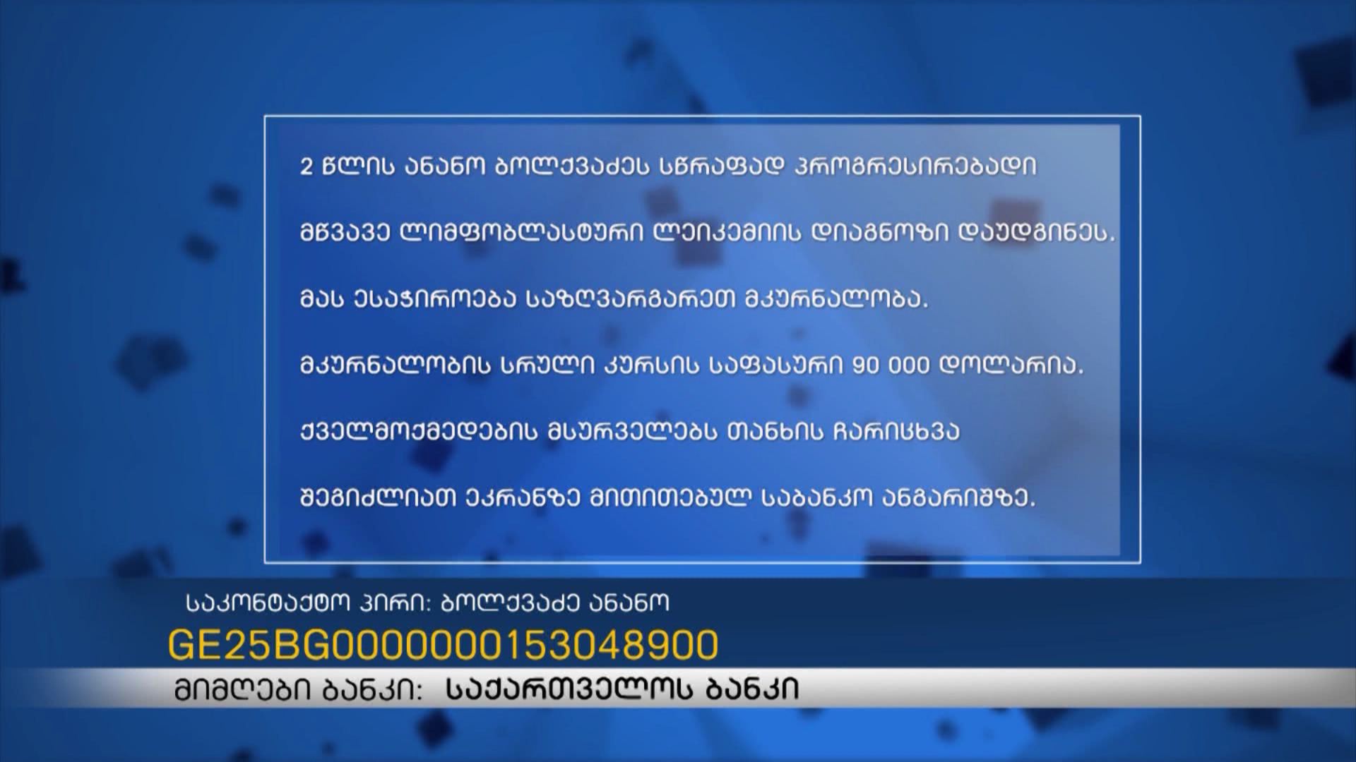 2 წლის ანანო ბოლქვაძეს მწვავე ლიმფობლასტური ლეიკემია დაუდგინდა, რომელიც სწრაფად პროგრესირებადია, მას საზღვარგარეთ მკურნალობა ესაჭიროება, რაც დიდ თანხებთანაა დაკავშირებული. ოჯახს...