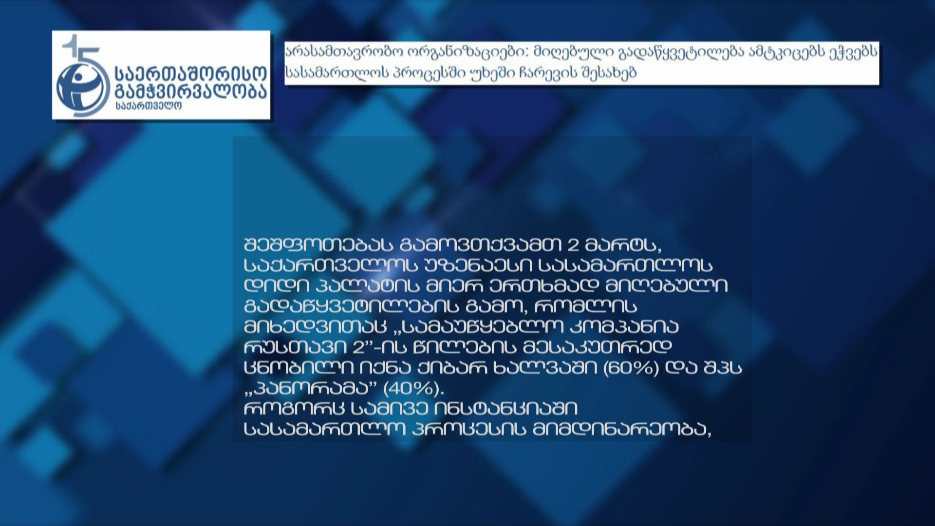უზენაესი სასამართლოს გადაწყვეტილებას არასამთავრობო ორგანიზაციები ეხმაურებიან. “შეშფოთებას გამოვთქვამთ 2 მარტს, საქართველოს უზენაესი სასამართლოს დიდი პალატის მიერ ერთხმად მიღებული გადაწყვეტილების გამო,...