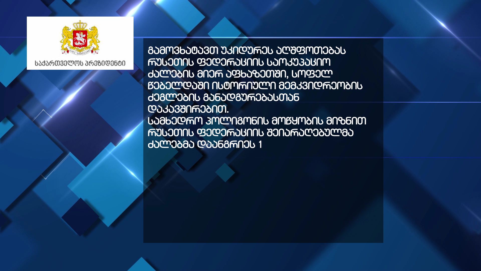 საქართველოს პრეზიდენტი საერთაშორისო ორგანიზაციებისაგან რუსეთის საოკუპაციო ძალების მიმართ რეაგირებას ითხოვს. გიორგი მარგველაშვილი აღშფოთებას გამოთქვამს რუსეთის ფედერაციის საოკუპაციო ძალების მიერ აფხაზეთში...
