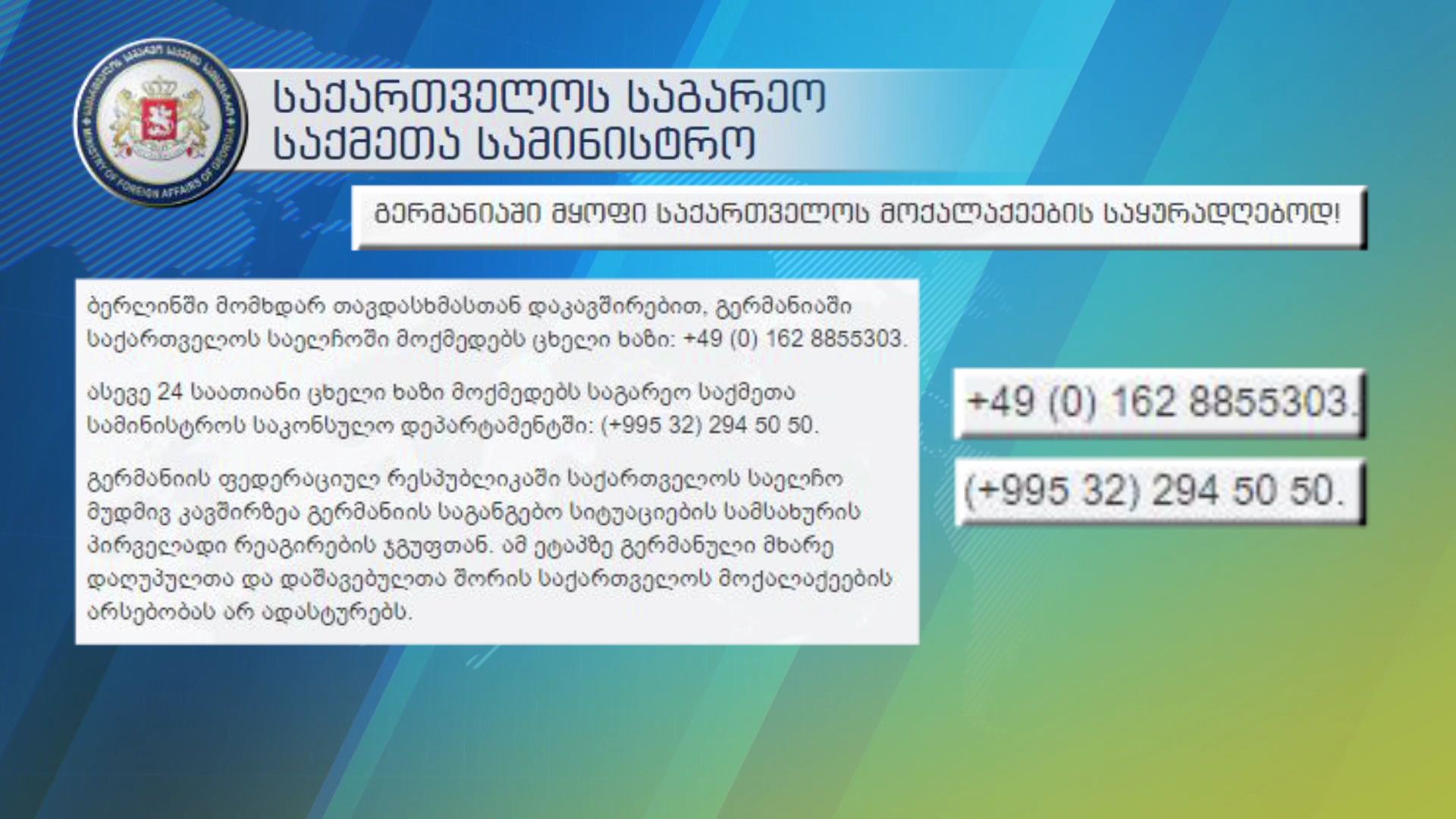 ბერლინში მომხდარ თავდასხმასთან დაკავშირებით, გერმანიაში საქართველოს საელჩოსა და საგარეო საქმეთა სამინისტროს საკონსულო დეპარტამენტში 24 საათიან რეჟიმში მუშაობს ცხელი ხაზი. უწყება...