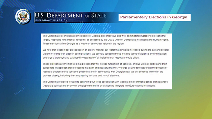 საქართველოს 8 ოქტომბრის საპარლამენტო არჩევნების წარმატებით ჩატარებას ულოცავს ამერიკის სახელმწიფო დეპარტამენტი. “არჩევნები კონკურენტული და კარგად ადმინისტრირებული იყო, რომელმაც, ეუთოს დემოკრატიული...