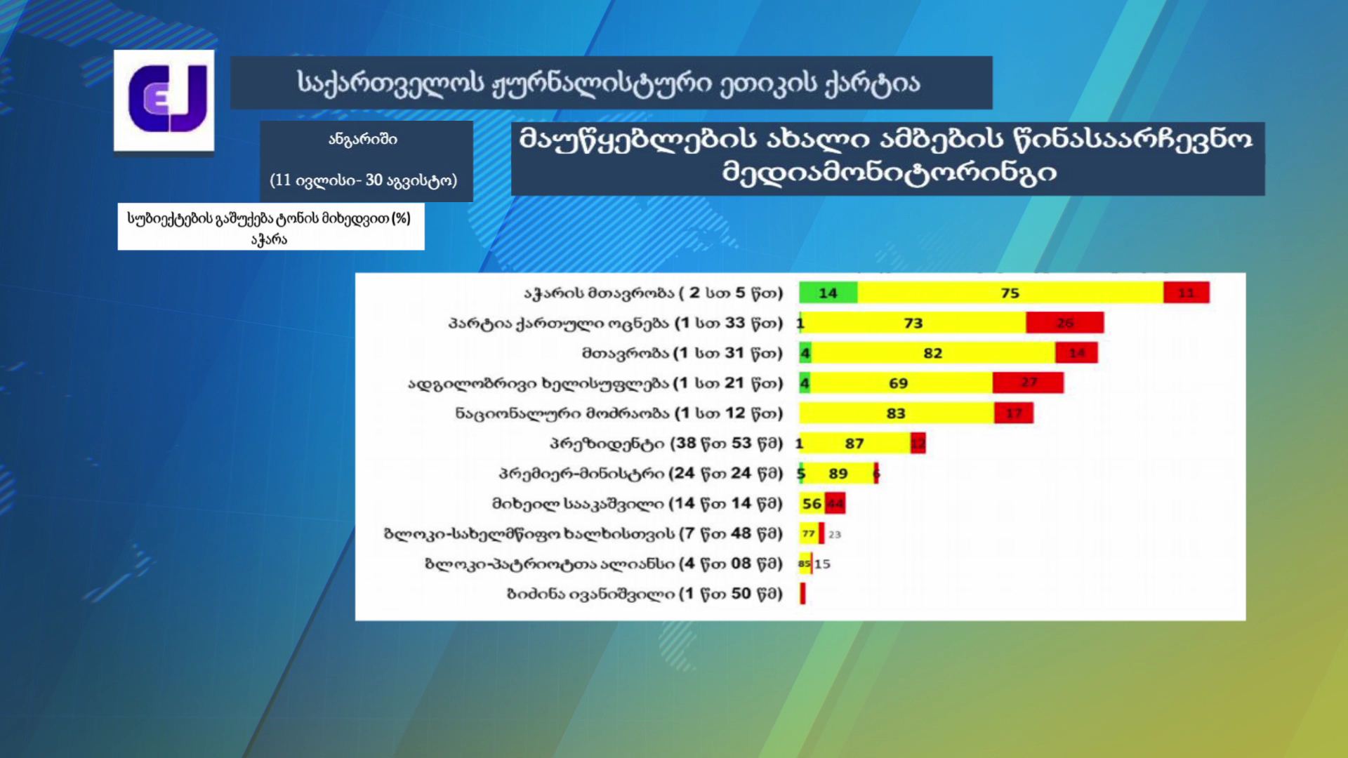 რაც შეეხება ჟურნალისტური ეთიკის ქარტიის ახალი ამბების მონიტორინგის შედეგებს, წინასაარჩევნო პერიოდში 11 ივლისიდან 30 აგვისტოს ჩათვლით საზოგადოებრივი მაუწყებლის აჭარის ტელევიზიას...