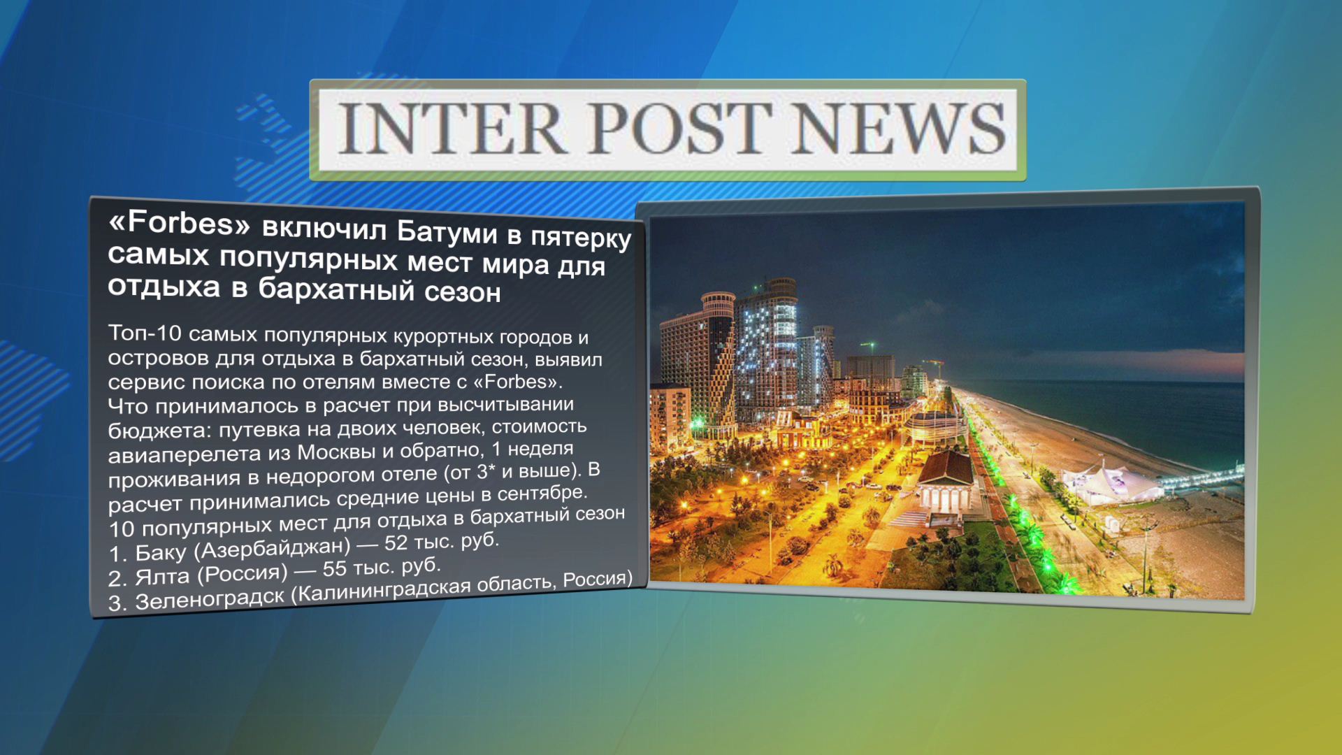 ''ხავერდოვან სეზონზე“ საუკეთესო კურორტებს შორის ბათუმი მეხუთე ადგილზეა. რეიტინგს გამოცემა FORBES-სი აქვეყნებს. რეიტიგნში ბათუმი უსწრებს ისეთი ქვეყნის კურორტებს როგორებიცაა პორტუგალია, იტალია,...