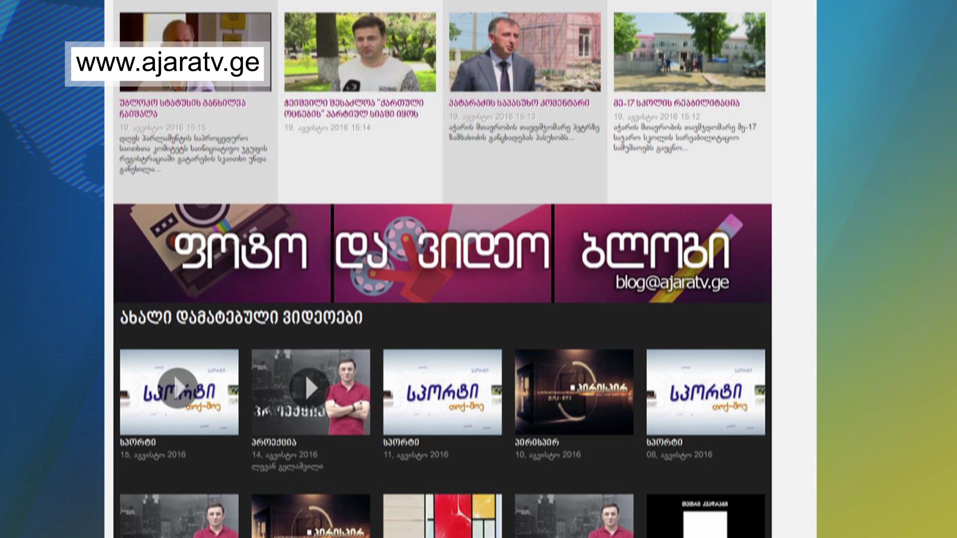 ჩვენი არხის ვებ-პორტალზე შეიქმნა ფოტო-ვიდეო ბლოგის განყოფილება. ნებისმიერ მსურველს შეგიძლიათ გამოგზავნოთ მოლენის, პრობლემის ან გარემოს ამსახველი ფოტოები, მისამართზე - blog@ajaratv.ge ...
