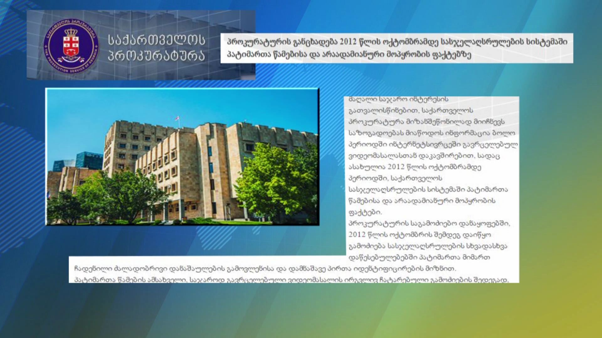 ინტერნეტსივრცეში გავრცელებული პატიმართა ცემა-წამების ამსახველი ვიდეომასალის წარმომავლობისა და გავრცელების ფაქტთან დაკავშირებით, მთავარი პროკურატურა მოკვლევას იწყებს. გამოძიება ე.წ. ციხის კადრების საქმიდან...