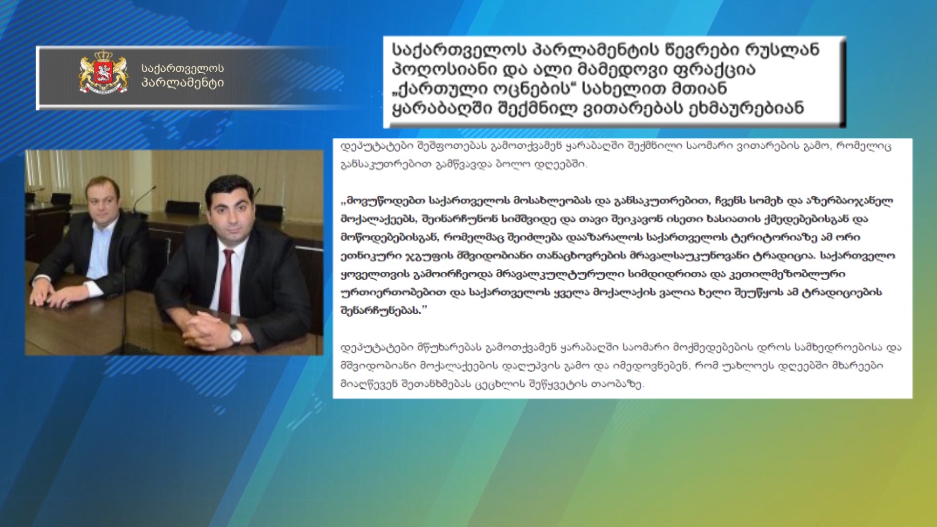 ყარაბაღში შექმნილ საომარი ვითარებასთან დაკავშირებით საპარლამენტო უმრავლესობის დეპუტატები რუსლან პოღოსიანი და ალი მამედოვი ერთობლივ განცხადებას ავრცელებენ. ისინი შეშფოთებას გამოთქვამენ და...